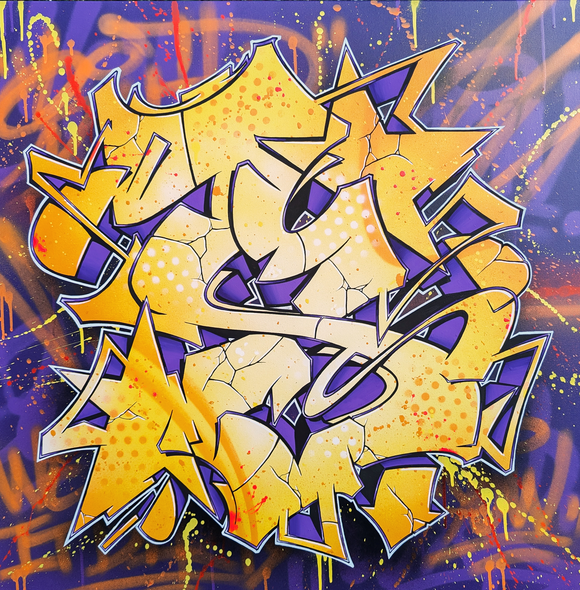 Bombes et marqueurs sur toile 80 x 80 cm, MDF 15x 15 cm, et tag MDF 3 couches découpe laser